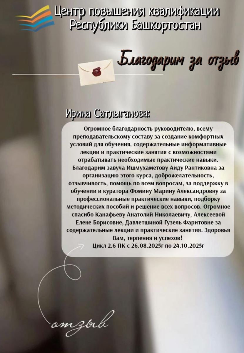 Спешим поделиться приятным отзывом наших слушателей, которые 24 октября заканчивают обучение на Цикле 2.6 ПК.