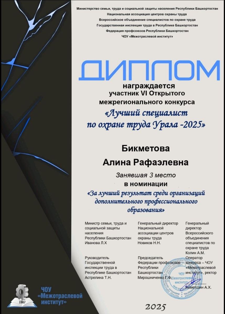 По итогам прошедшего в ноябре прошлого года VI Открытого межрегионального конкурса «Лучший специалист по охране труда Урала - 2025» наша коллега, специалист по охране труда Центра повышения квалификации Алина Бикметова заняла 3 место!