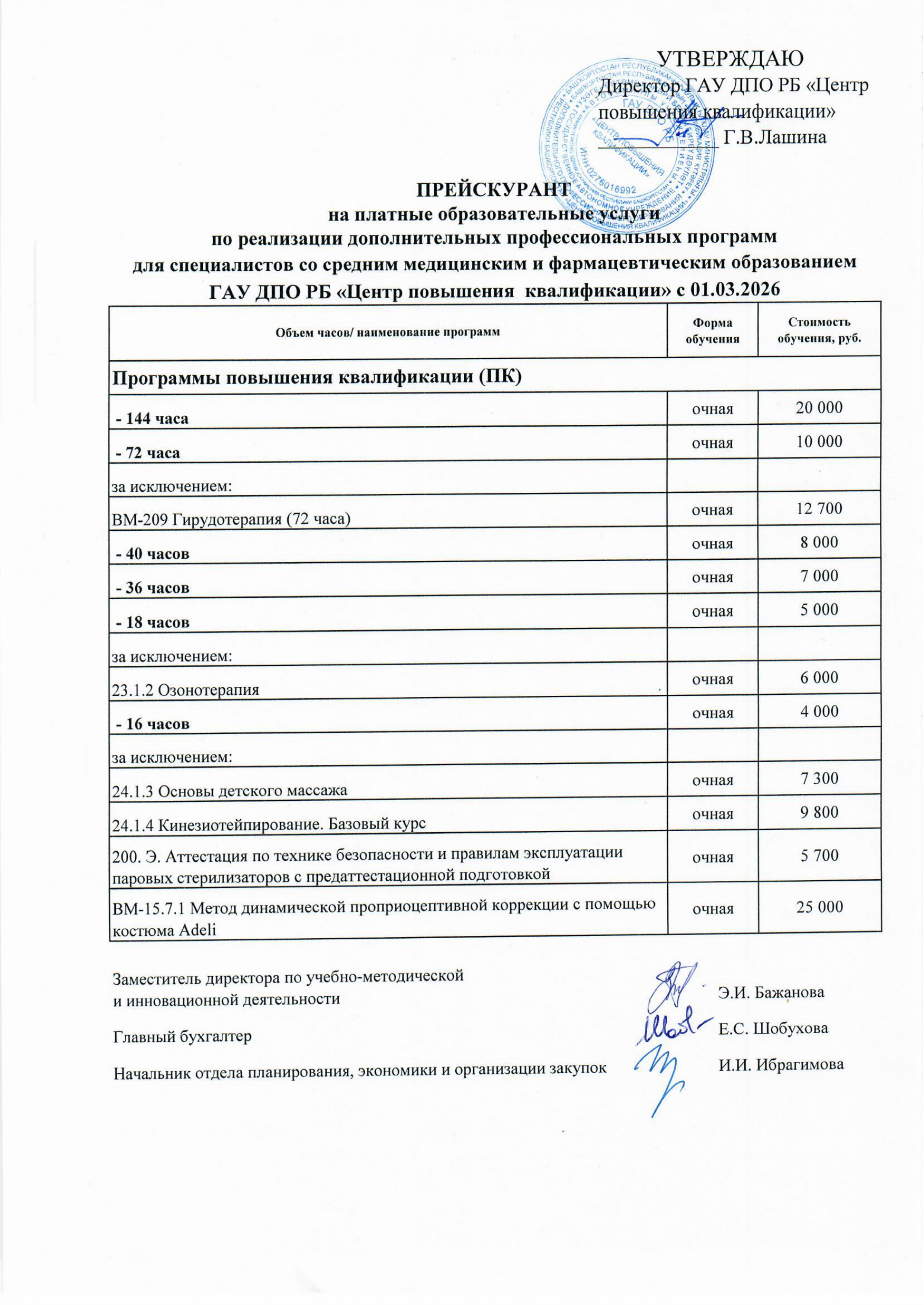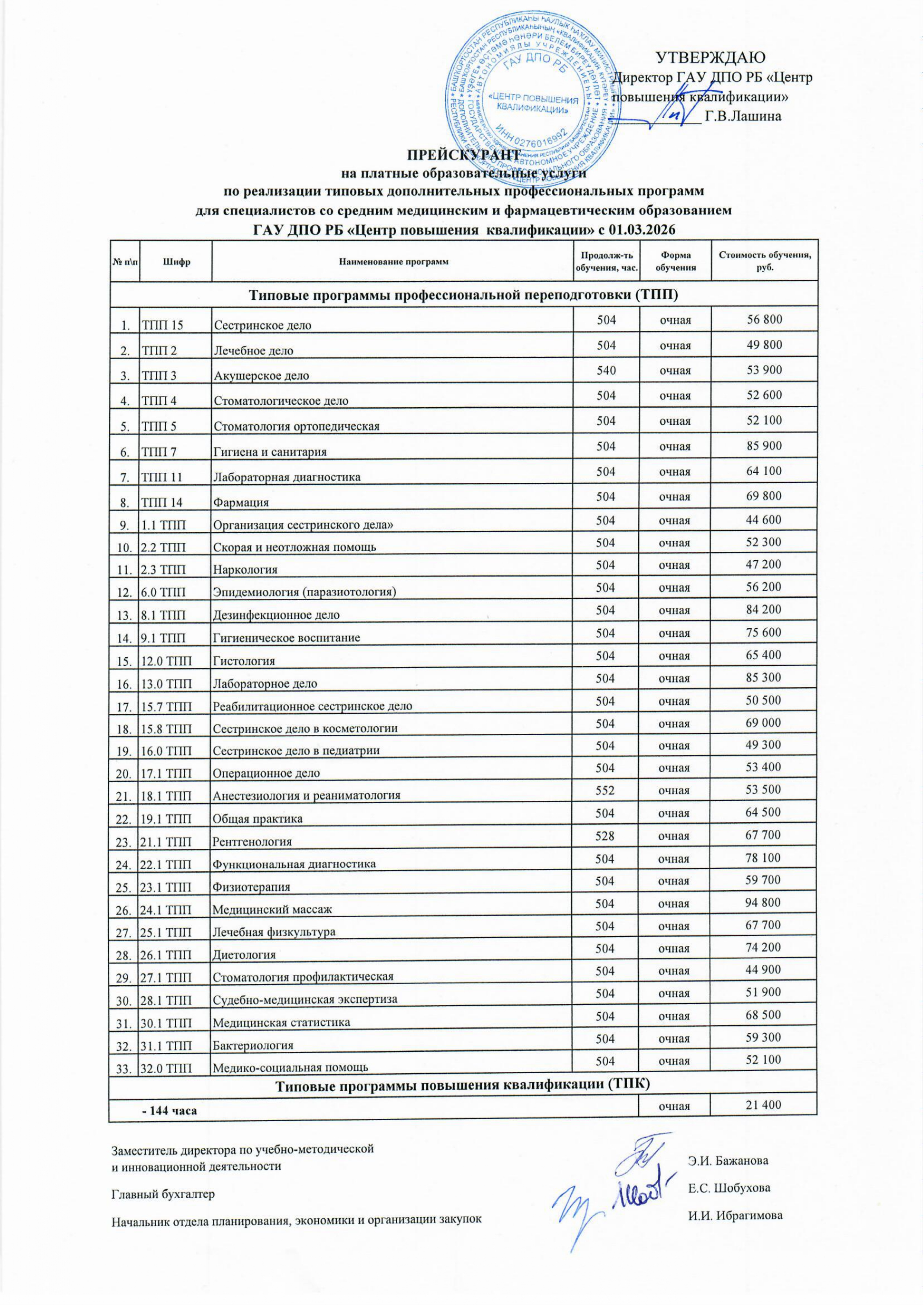 Прейскурант цен по обучению специалистов со средним медицинским и фармацевтическим образованием